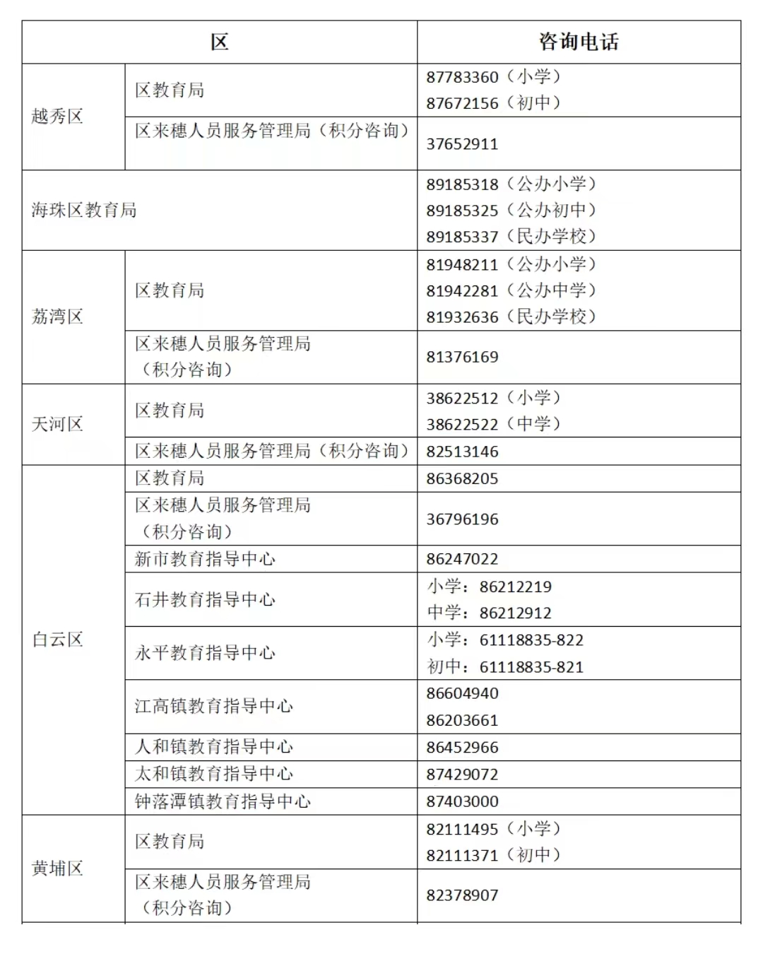 七、各区咨询电话