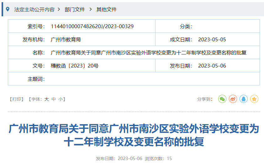 5月6日,广州市教育局发布关于同意广州市南沙区实验外语学校变更为十二年制学校及变更名称的批复(以下简称“批复”)。批复显示,广州市南沙区实验外语学校变更为十二年制学校,学校名称同步变更为广州市南外实验学校,该校为非营利性民办学校,面向全市招生。