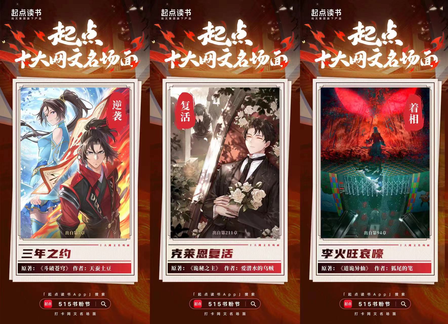 三部作品成书于不同年份,也反映了书粉在票选时横跨二十余年的时间选择范围。在最终入选十大名场面的作品中,既有《斗破苍穹》《全职高手》等完结多年的经典,也有《诡秘之主》《大奉打更人》等新近完结的佳作,还有《道诡异仙》《深海余烬》等正在连载的高人气作品,展现出起点持续输出好故事的能力,更体现了好故事穿越时间的生命力。