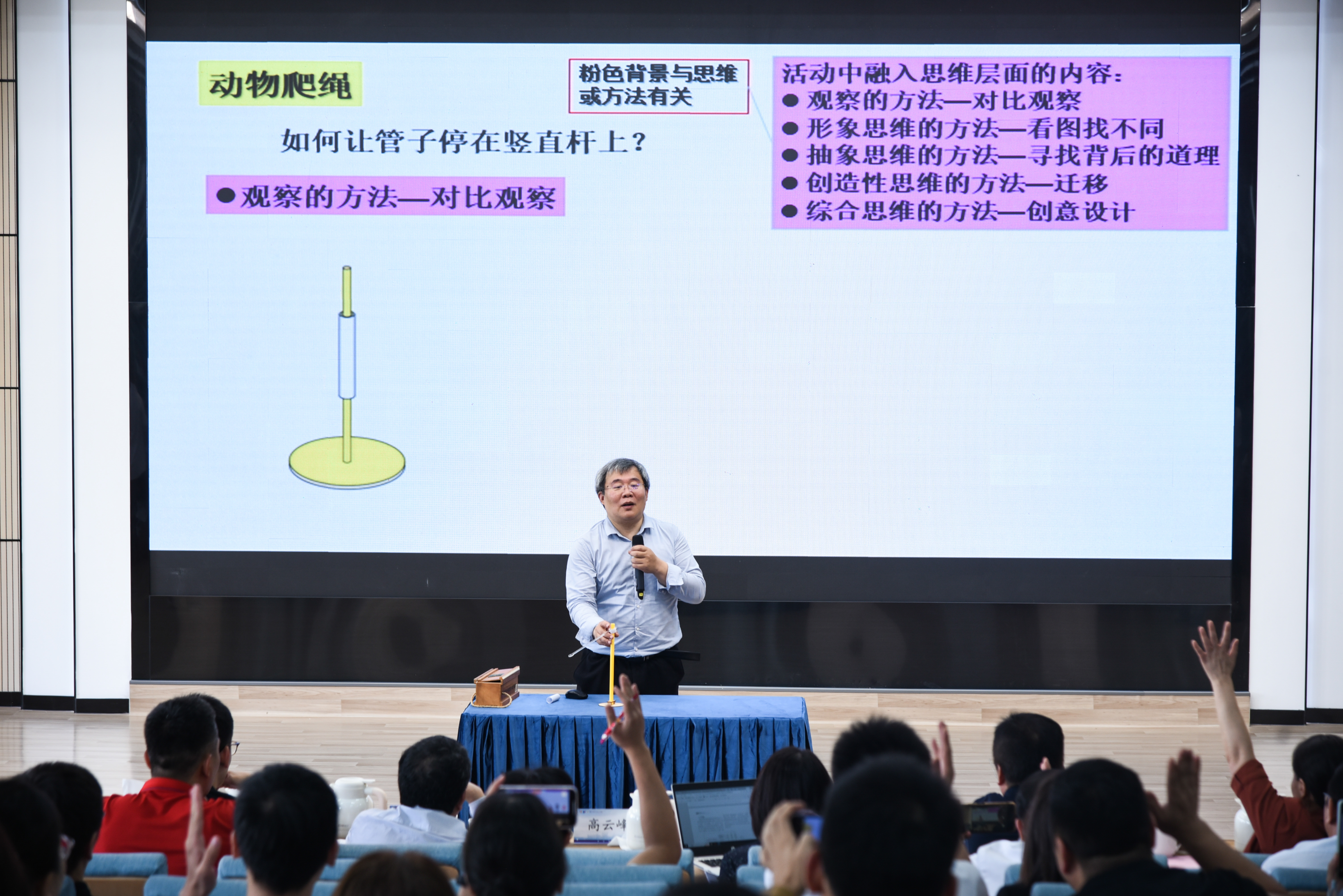 会上,高云峰教授以“科学教师开展探究实践活动的技能提升”为题开展了精彩的学术讲座。高教授结合大量探究实践活动的鲜活案例,并通过现场的探究互动,揭示了探究实践活动的本质规律、底层逻辑和一般过程。他强调在探究实践活动中,教师要善于“从无疑处生疑”,设计富有挑战性和趣味性的探究问题,引导学生学会观察和推理,善于整理和利用数据,重视培养学生的创造思维、计算思维和工程思维,重视引导学生运用跨学科的知识来解决实际问题,让学生像科学家一样思考,像工程师一样创造。