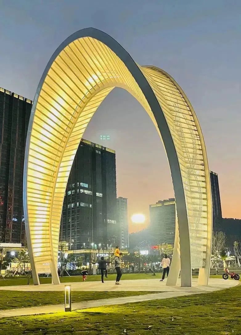炫酷的圆环露天舞台是绿轴公园标志建筑,四周环绕着风雨长廊,市民在露营时可饱览四面风光,感受“都市绿洲”的宁静惬意。