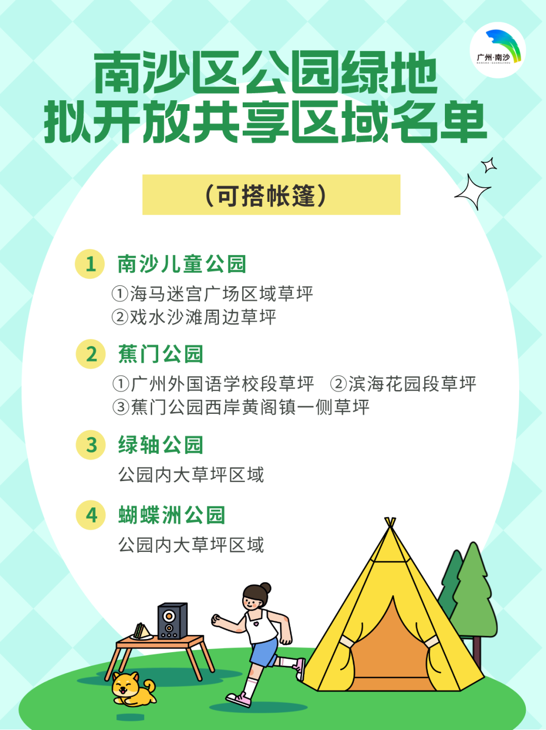5月4日,广州市林业和园林局发布了关于公开征求《广州市公园绿地开放共享区域名单》(以下简称“《名单》”)意见的公告。《名单》公示了73个可搭帐篷开放共享区域和29个可开展其他活动区域的绿地点位。其中,南沙区拟开放7个大草坪供游客搭帐篷。