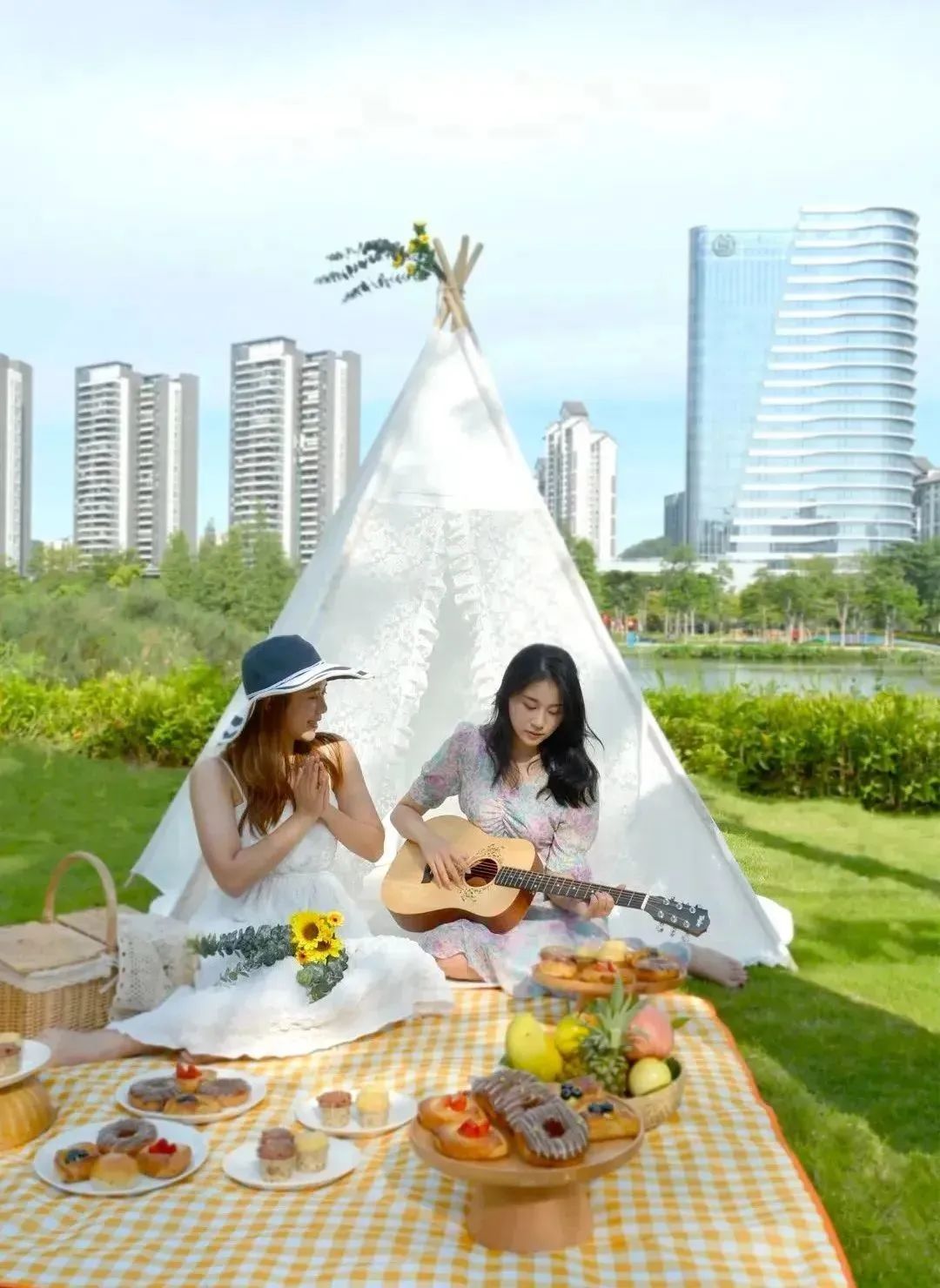 搭起帐篷、铺上野餐垫,孩子在一旁嬉戏打闹,大人们吃着零食、聊着天,尽情享受夏日悠闲时光。