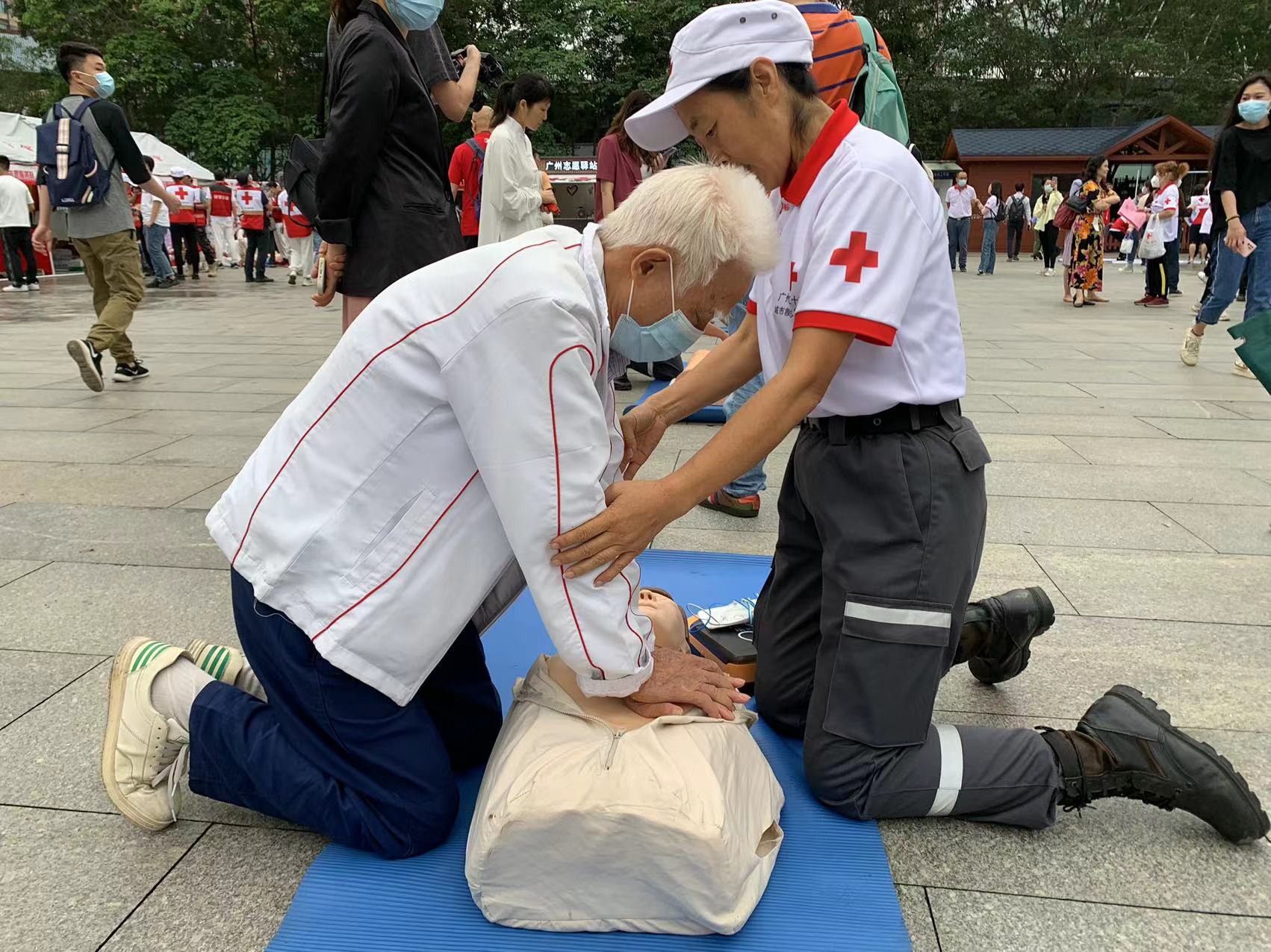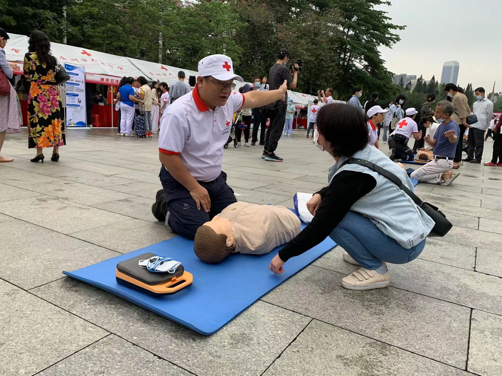5·8世界红十字日纪念活动暨广东省2023年红十字博爱周活动启动仪式现场,广州市红十字会志愿者在向市民讲解心肺复苏做法。