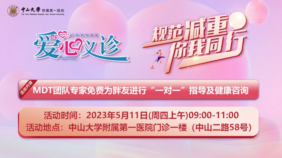 在“5·11中国肥胖日”来临之际,为普及疾病知识,提高市民健康水平,5月11日,中山大学附属第一医院将举办“规范减重,你我同行”MDT团队义诊活动,届时医院普外科、儿童内分泌专科、健康管理中心、临床营养科、内分泌科,中医科权威专家将为进行现场咨询解答“科学减重”!