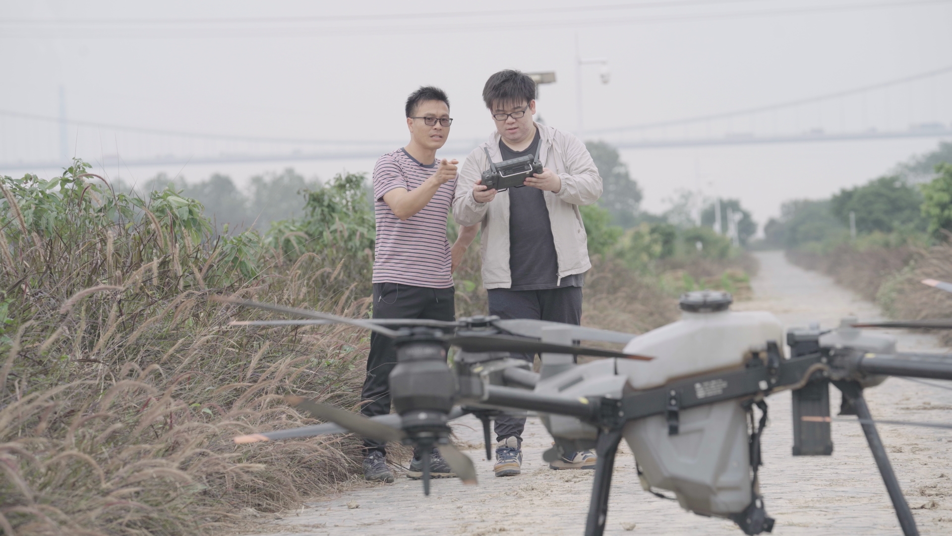 第一次来到“无人农场”时,负责该项目运营的华南农业大学黄埔创新研究院技术人员覃兴谋和黎观炯正在田边调试设备准备播种。