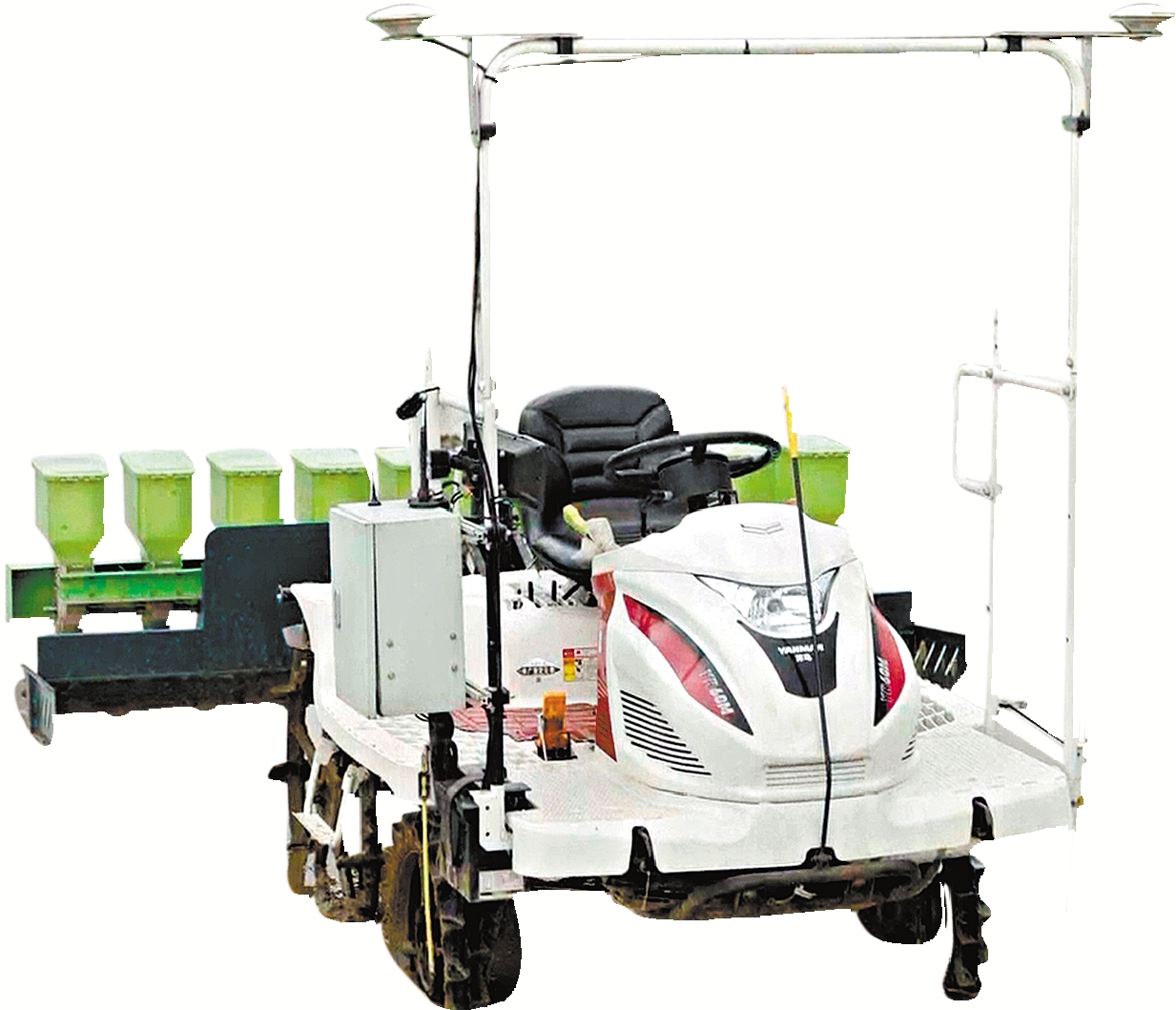 指着白色车头、带有10个绿色排种器的无人驾驶水稻直播机,黎观炯告诉记者:“这台直播机通过北斗导航精准定位,提前设定好路线,然后把经过浸种和催芽的稻种放进排种器,就可以进行无人作业了。”据介绍,这种无人驾驶水稻直播机采用的是“同步开沟起垄水稻精量穴直播技术”,直播机在田面同步开出蓄水沟和播种沟,播种沟位于两条蓄水沟之间的垄台上,排种器将稻种有序地播在垄台上的播种沟中,增加了稻种入土深度,减少了倒伏。