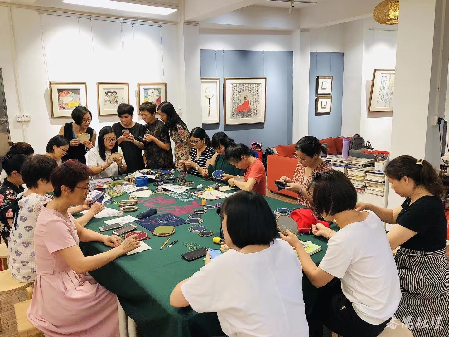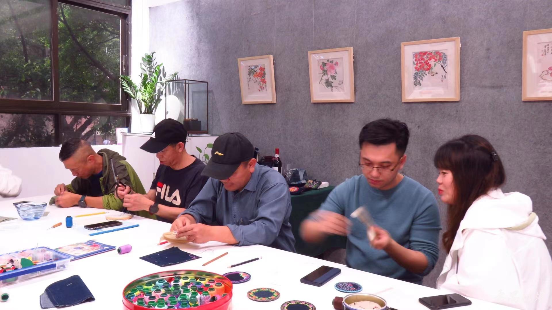 除了举办公益艺术展外,胡婉仪还经常邀请来自民间的艺术人才进行公益的艺术授技和分享。在2021年的元宵佳节,紫羽艺术空间还特意举行了一场“男子汉 学刺绣”的公益刺绣培训班。那些前来体验刺绣魅力的“爷们”在民间刺绣艺人梁宝贞的悉心引导下,很快便学会飞针走线,颇见成效。