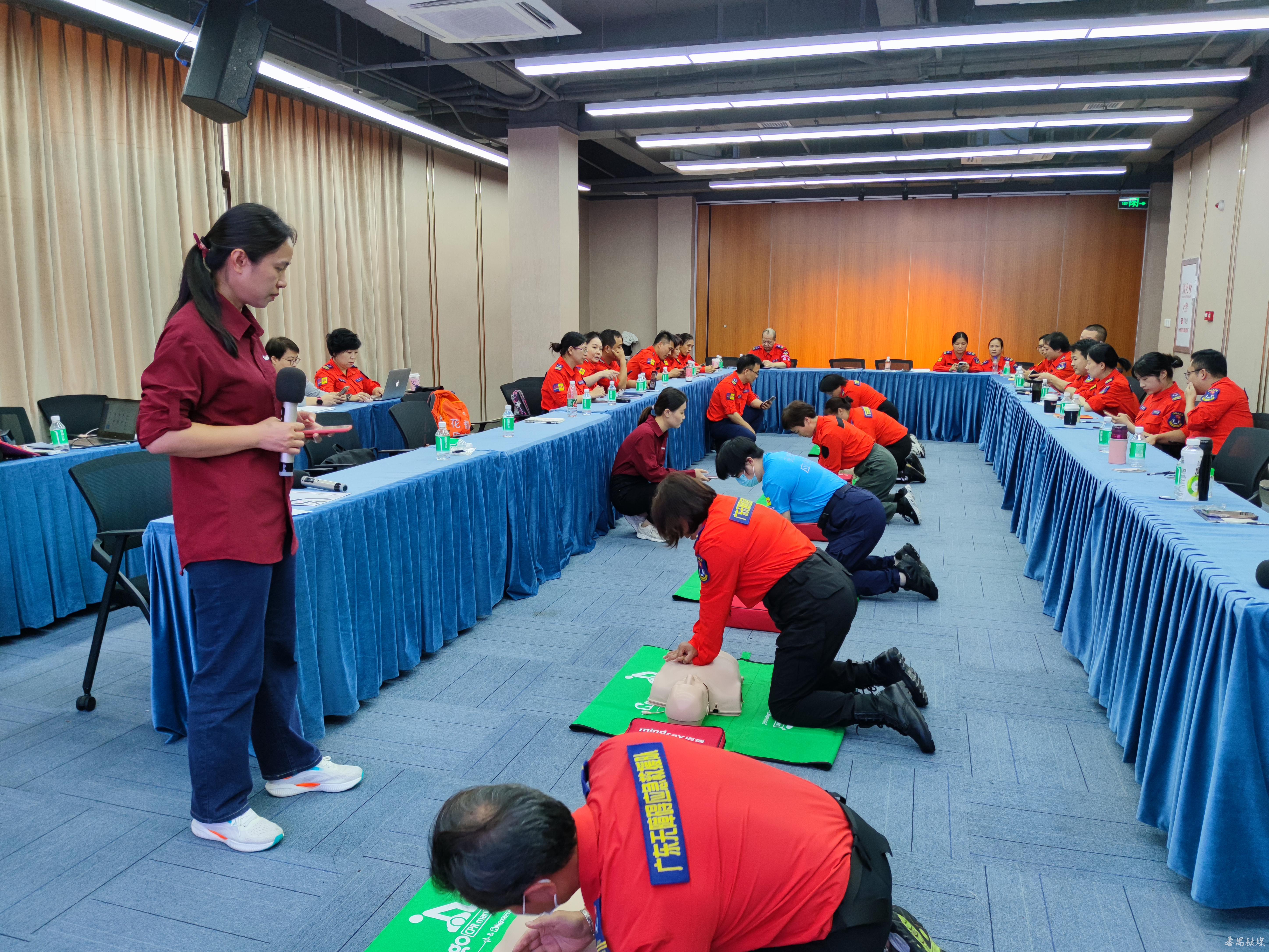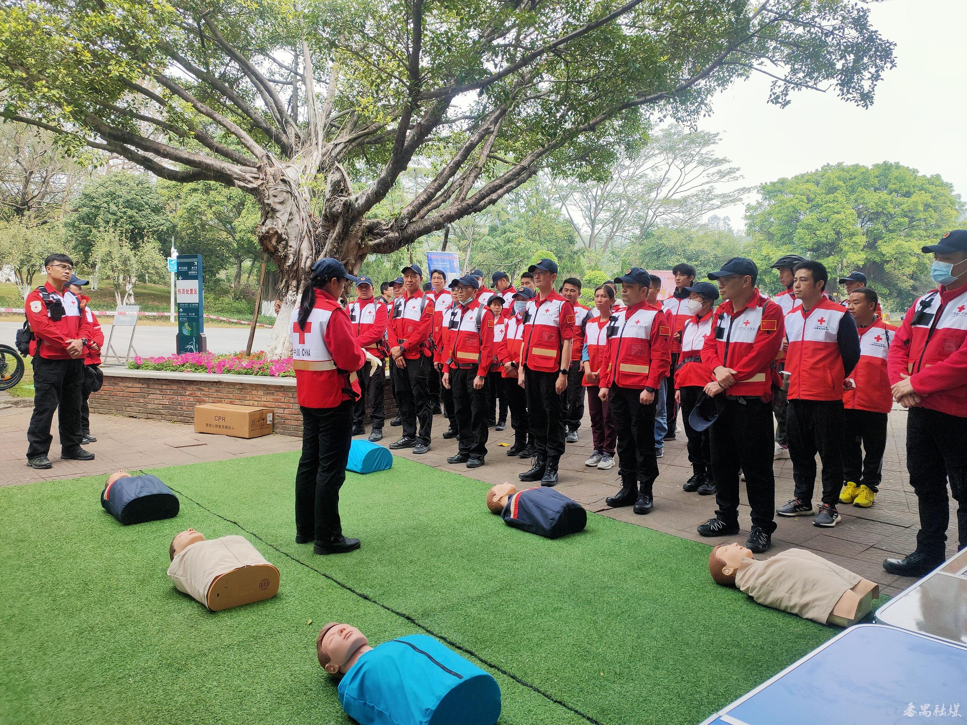 胡婉仪在大夫山森林公园市红会应急服务点为山地救援队队员复训CPR技能