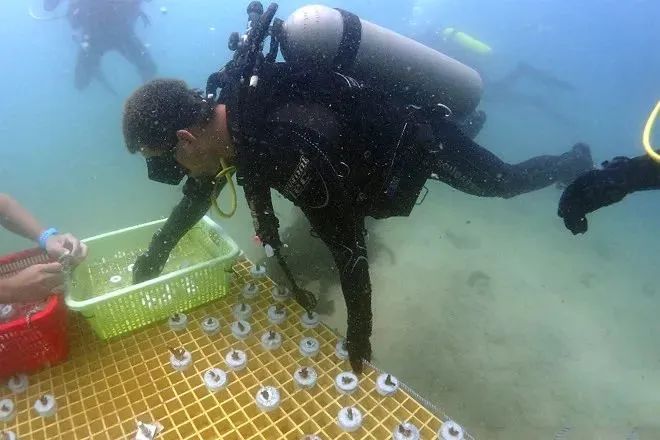 为促进梅沙海域生态的加快修复,2016年,在多轮实地调研以及与科研机构的探讨后,盐田区海洋生态环保服务中心正式启动了大梅沙珊瑚种植和保育项目。杨旭聪和他的团队开始采用人工干预的方式加快珊瑚礁的修复。这是一种具有较高难度的方法,他们需要从珊瑚上选出分枝剪下放进“育儿所”中,在合适的人工环境里珊瑚枝会像树木一样发芽,变身为珊瑚苗。然后,他们会潜水将这些幼苗粘连在海底的珊瑚礁上使之融为一体。