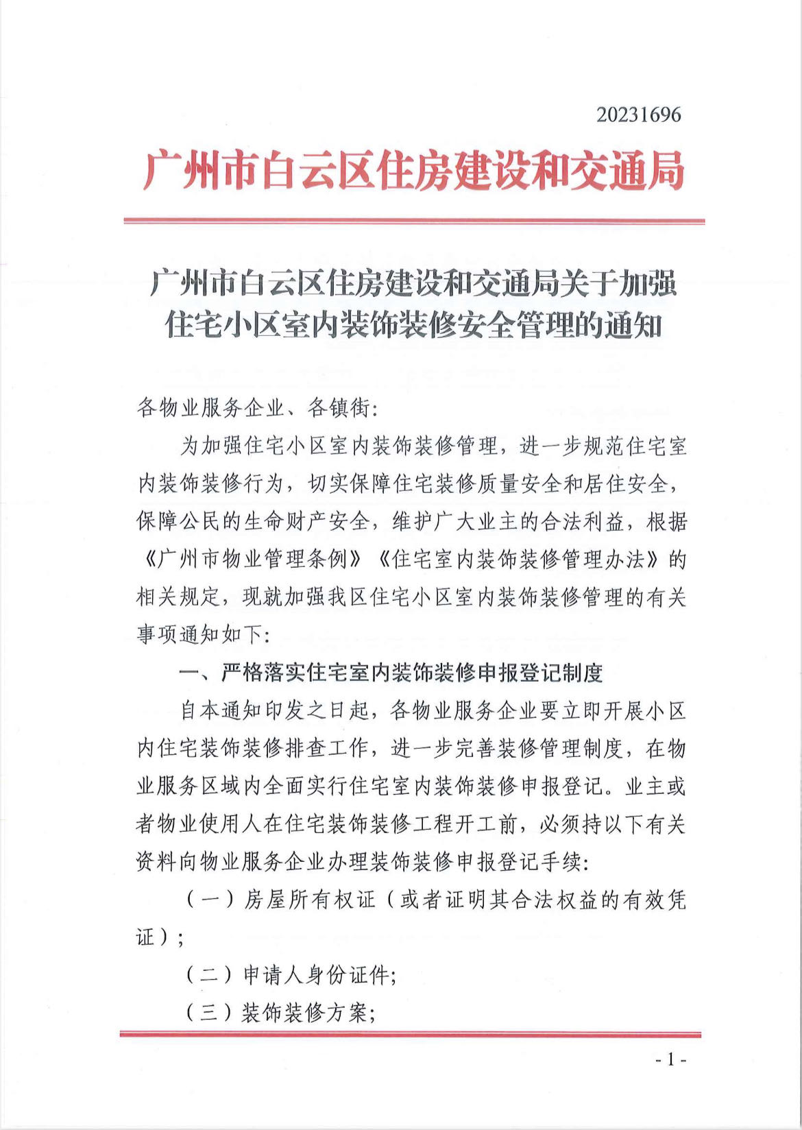 这几日,白云区内各物业服务企业、各镇街陆续收到《广州市白云区住房建设和交通局关于加强住宅小区室内装饰装修安全管理的通知》。