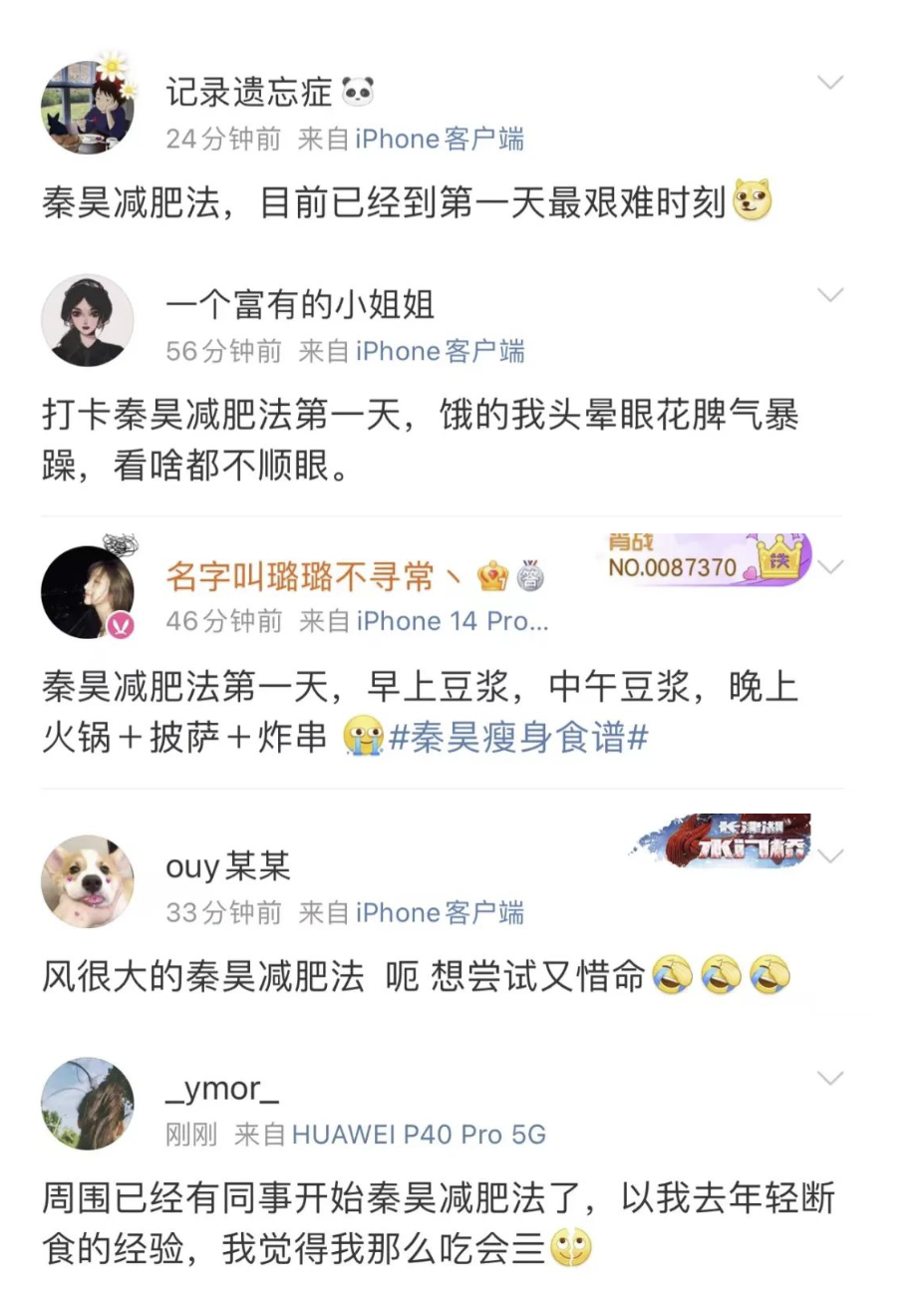 5天的食谱,第一天只喝原味豆浆,第二天只吃玉米棒,第三天只吃水果,第四天只吃虾蛋,第五天只吃绿叶菜……随后,这个食谱冲上热搜,并被网友戏称为“秦昊减肥法”。