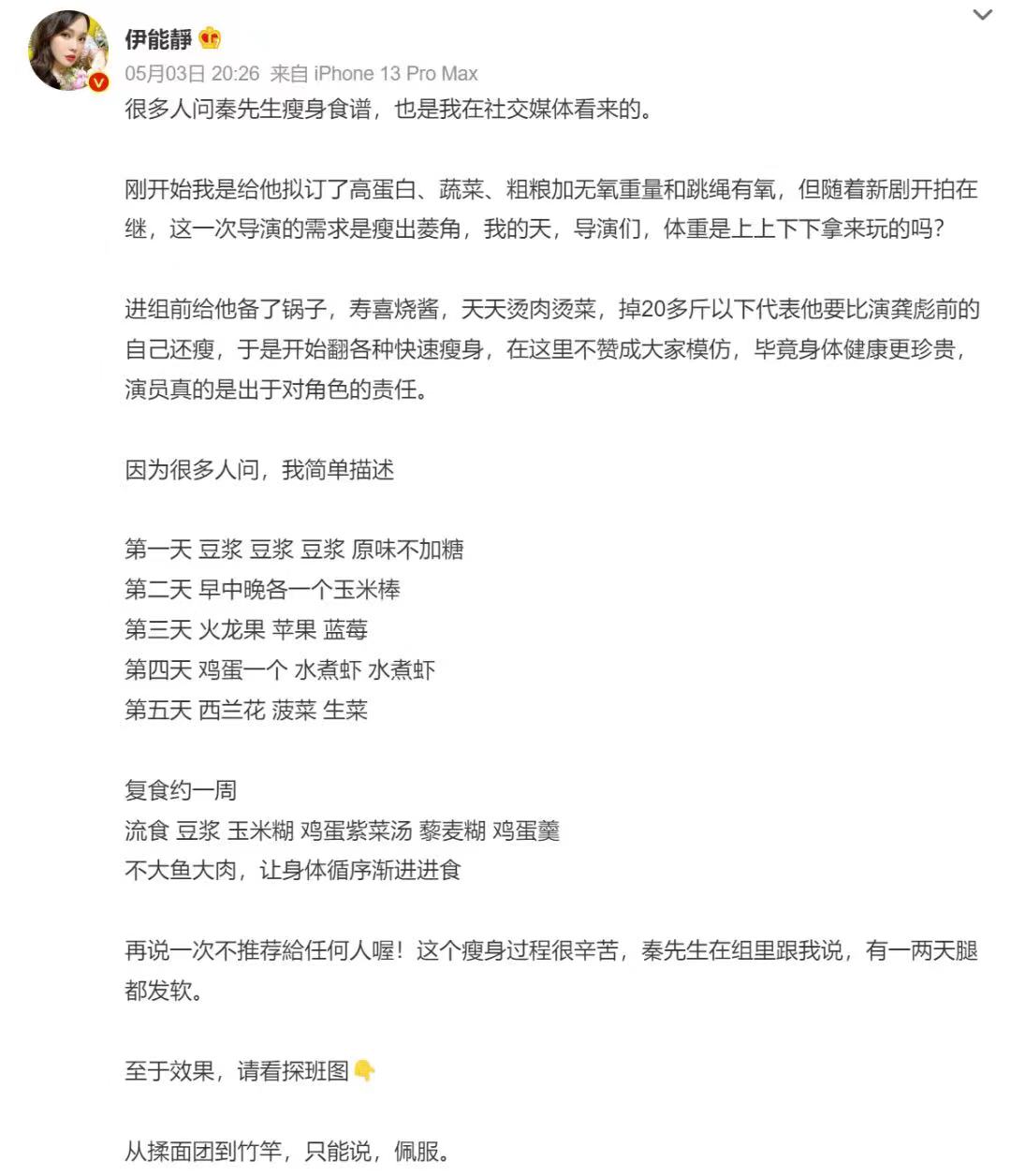 为了配合角色需要,秦昊在剧中增肥二十斤。但后来因为新剧角色需要,他又要快速瘦身。5月3日,他的妻子伊能静在微博上分享了秦昊的瘦身食谱,并表示是“出于对角色的责任”,强调“不推荐给任何人”。