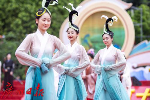 开幕式在非遗民俗表演《非遗贺诞》中拉开序幕。本土黄阁麒麟舞用丰富的形式为市民展示了黄阁麒麟舞历经300多年传承的活力与艺术之美。15头制作精巧、活灵活现、色彩鲜艳、耀眼夺目的麒麟同时出现,在舞台上奔跑跳跃,翩翩起舞。同时,舞者的服饰配合了麒麟袍的颜色和图案,与麒麟融为了一体。由50人齐齐献艺的潮汕地区英歌舞同样声势浩大,脸涂油彩的队员们手执一对彩色木槌,配合鼓点挥动双槌交错翻转叩击,在昂扬激进的锣鼓声中变换队形动作,边走边舞,踏步而来。今年来,潮汕英歌舞频频“出圈”“霸屏”网络,被网友称为“民间街舞”“中华战舞”,彰显优秀传统文化的生命力和影响力。