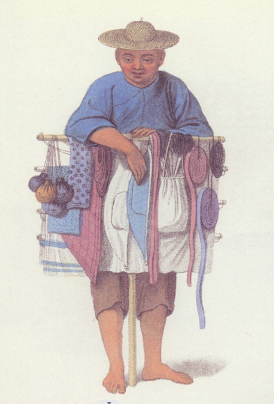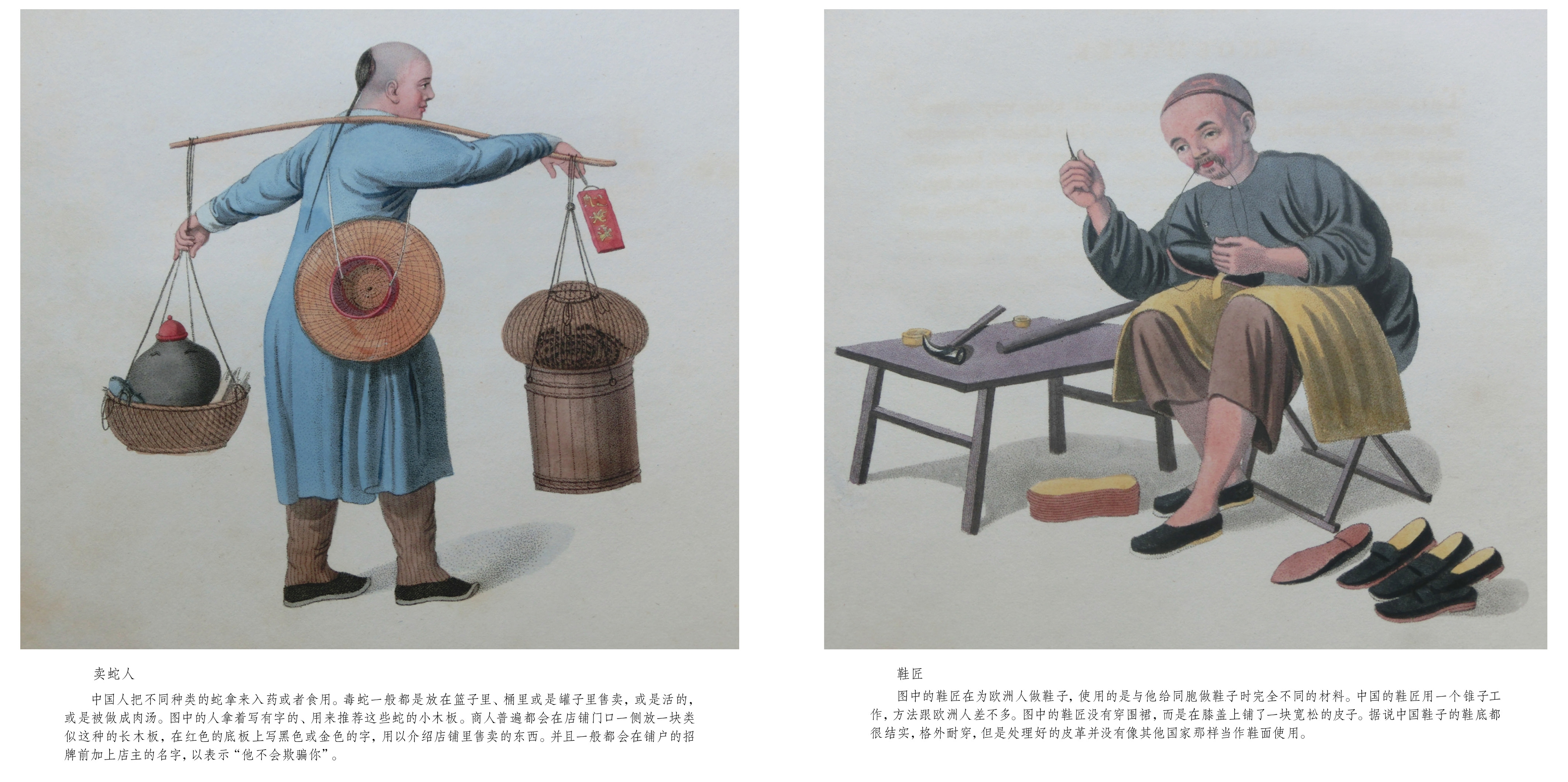 《中国服饰》英文首版于1800年,作者乔治·亨利·梅森是英军第102团的少校,其生平国内外皆不可考,以至有人怀疑这名字只是一个假托。《中国服饰》中的原稿画作作者——广州外销画匠蒲呱的生平也不可考,“蒲呱”应该是当时广州外销画最常见的署名之一。这些作品描绘了我国18—19世纪各行各业的不同着装和人物形态,上至官员贵妇,下至贩夫走卒,可谓面面俱到。尤为可贵的是,作者笔触涉及了若干最容易被历史风尘湮没的小人物——鞋匠、铁匠、酿酒师、渔民、制筒匠、碾磨工、捕蛇人等等,其中的画作经常被后人引用,成为西方在中国学及艺术史上的永恒经典。