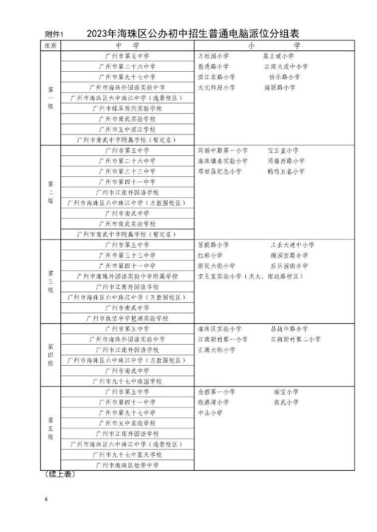 5月11日,广州市海珠区教育局发布《2023年广州市海珠区初中招生问答》,并公布该区公办初中招生普通电脑派位分组表。今年共设十个分组,其中,广州市第六中学在4个组招生,广州市第五中学在5个组招生,广州市南武中学在4个组招生,将于今年9月新开办的广州市南武中学附属学校(暂定名)则在2个组招生。
