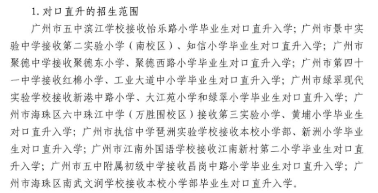 此外,海珠区部分学校试点开展对口入学的升学形式,通过直升方式录取的学生,不再参加电脑派位。具有以下小学学籍并具备海珠区电脑派位资格的学生,由家长在规定时间登录“海珠区公办初中招生网上报名系统”选择确认升学方式。