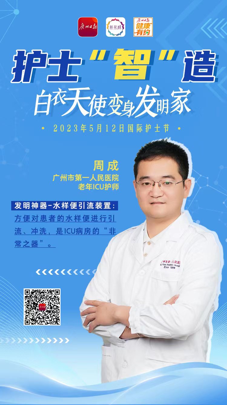 在临床工作中,患者因肛门括约肌松弛导致大便失禁的情况十分常见,此外还有一些疾病,如细菌性痢疾等急性肠道传染病也比较多发。因浠水便的刺激、护理不当等原因常造成患者肛周皮肤损伤,若不采取有效的治疗和护理 ,会造成肛周难愈性溃疡、肛周脓肿及真菌感染等并发症。为了解决这个问题,广州市第一人民医院老年ICU护师周成发明了一种水样便引流装置,方便对患者的水样便进行引流冲洗,降低失禁性皮炎及皮损的发生率,提高患者的生活质量,被称为ICU病房的“非常之器”。