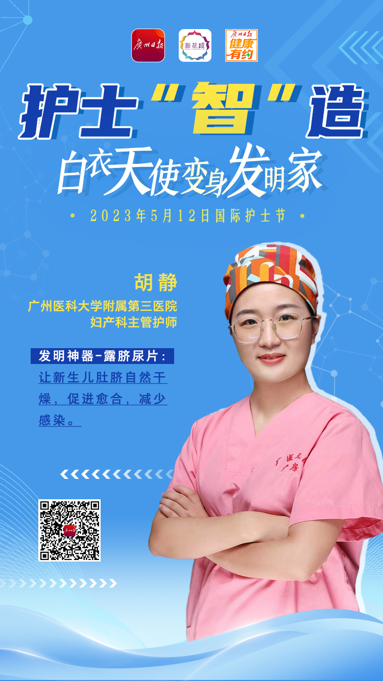 胡静是广州医科大学附属第三医院广州重症孕产妇救治中心分娩室的护士长。为了避免新生儿脐部污染、减少脐炎的发生,她自主研发并转化生产出一种“小神器”——“露脐尿片”。