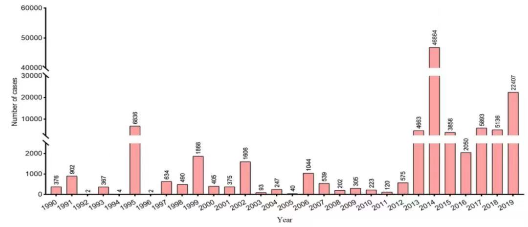 登革热自1978年开始在广州流行,2010年至2019年,广州登革热疫情反复,每年均有本地病例,其中以2014年病例数量最多,近4万例。现在,随着对外交流的增加,输入型病例增多,登革热再次成为我们需要密切关注和防范的重点疾病。