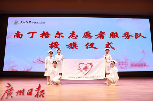 中国南丁格尔志愿者服务队副主任委员、中山一院护理学科带头人成守珍的授旗,正式成立南沙院区南丁格尔志愿者服务队。