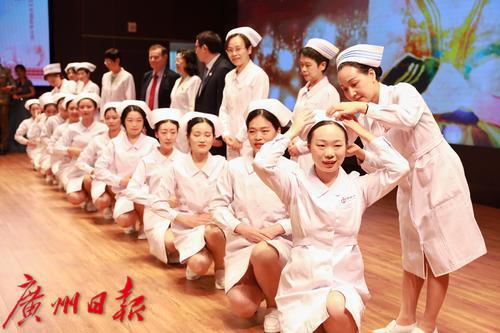 在授帽仪式环节,新一批的白衣天使半蹲身躯,由前辈们庄严的带上洁白的燕尾帽。
