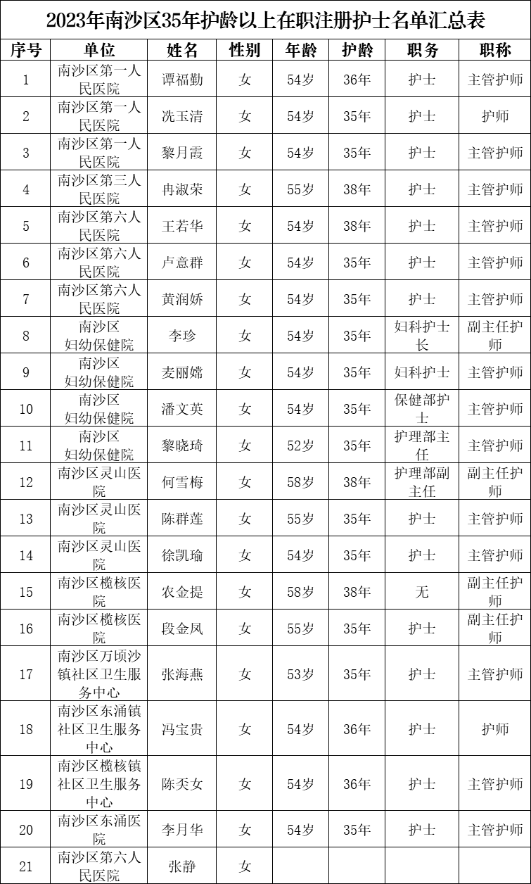 2023年南沙区35年护龄以上在职注册护士名单汇总表: