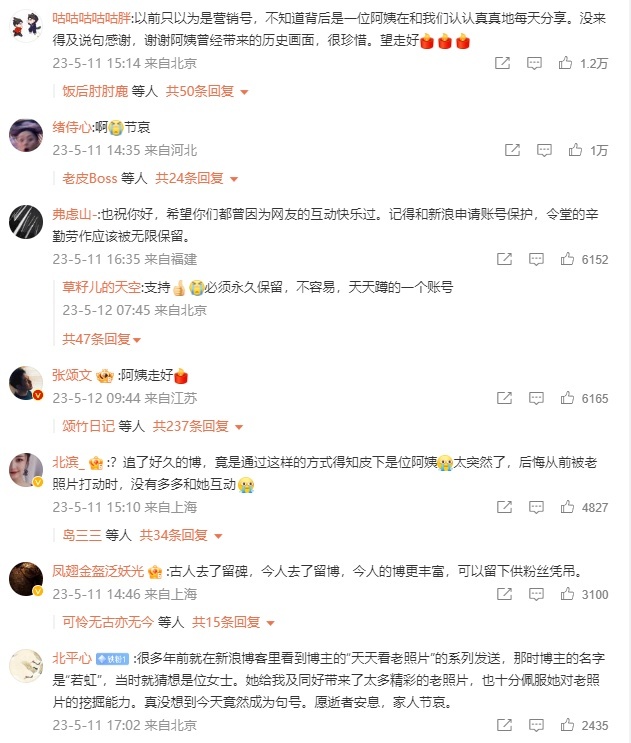 截至5月12日上午11时,这条微博被转发1.8万次、留言9775条,点赞超过10万。而微博话题#李大钊孙女#、#看老照片 停更#则分列微博热搜榜的第一和第四位。