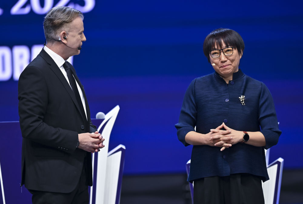 5月11日,中国足协副主席孙雯(右)作为抽签嘉宾在抽签仪式上。新华社发(尼库摄)