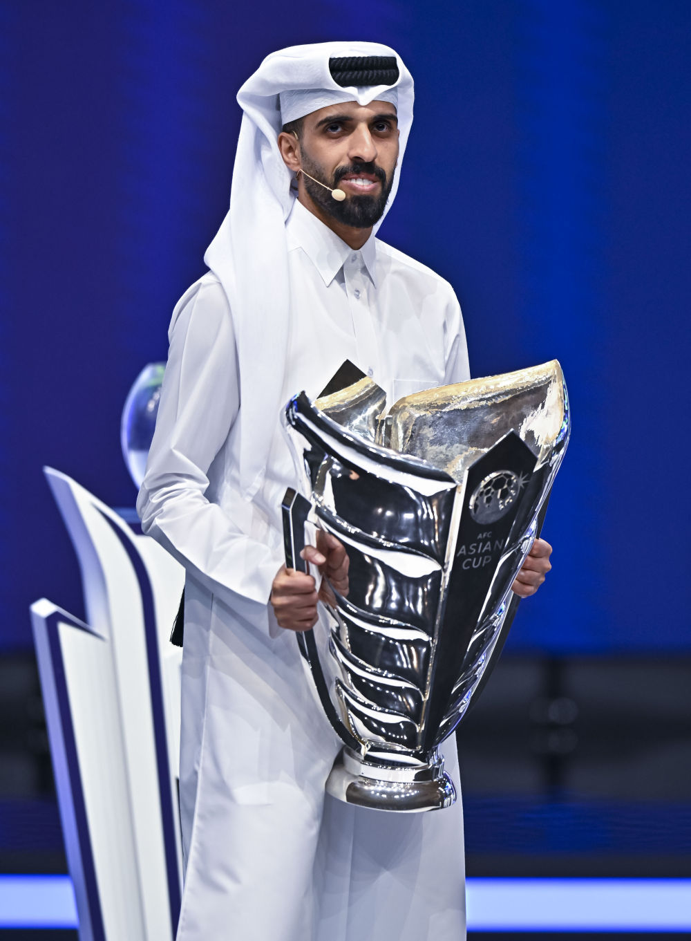 5月11日,卡塔尔队球员哈桑·海多斯在抽签仪式上携亚洲杯奖杯入场。新华社发(尼库摄)