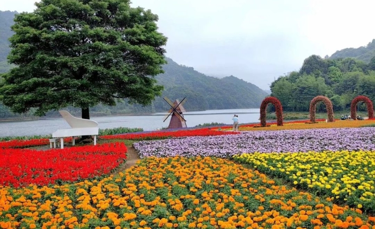 石门国家森林公园海拔约800米的山谷中,花海沿天池延绵两公里,与天池、原始次生林交相辉映。湖光山色,如诗如画。万寿菊、一串红、凤仙等多种花卉构成色彩斑斓的花海,相信妈妈一定喜欢。