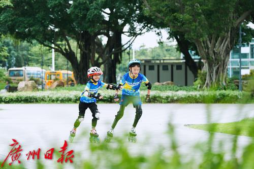 2023年5月13日,广州沿江东路,小朋友在林则徐纪念园玩滑轮。