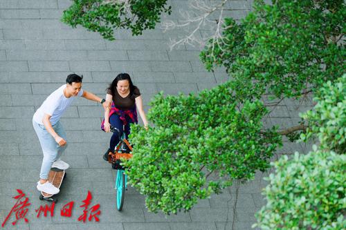 2023年5月13日,广州滨江中路,年轻人在珠江边骑单车、玩滑板。