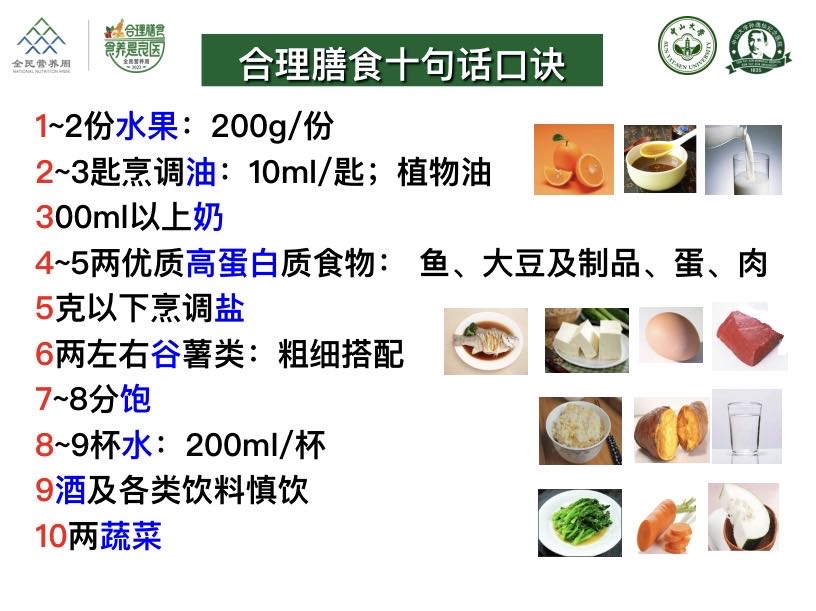 怎么吃,更健康?陈超刚说,我们有平衡膳食“八准则”与居民膳食宝塔的指引,食物要多样,每天建议12种或以上的食物,合理搭配,才能满足全面的营养,而具体怎么做,他总结了一份“合理膳食十句话口诀”: