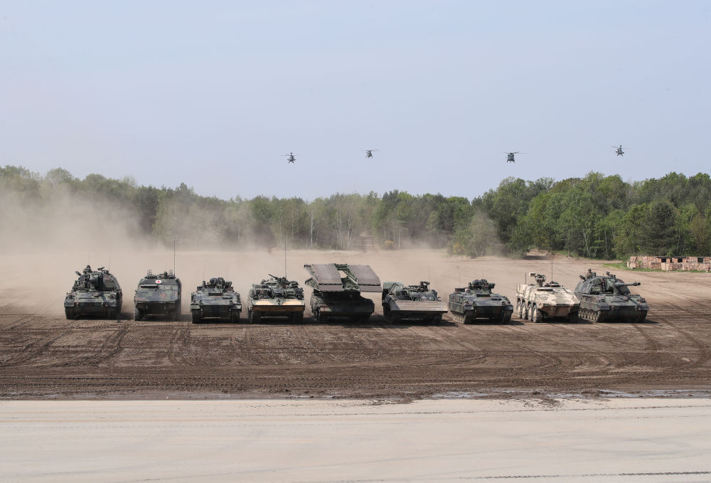 2019年5月20日,在德国蒙斯特,北约快速反应部队装甲车及直升机参与演示。新华社记者单宇琦摄