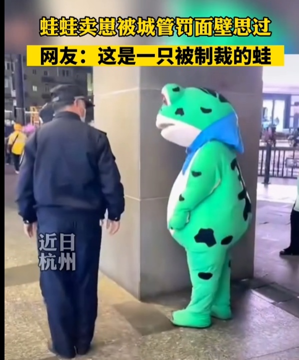 今年4月,浙江宁波海曙区交警正在路口执勤,发现有人穿着“网红蛙”的人偶服骑着电动自行车出行,交警将其拦下,发现骑车的是一名男子,没有佩戴安全头盔。