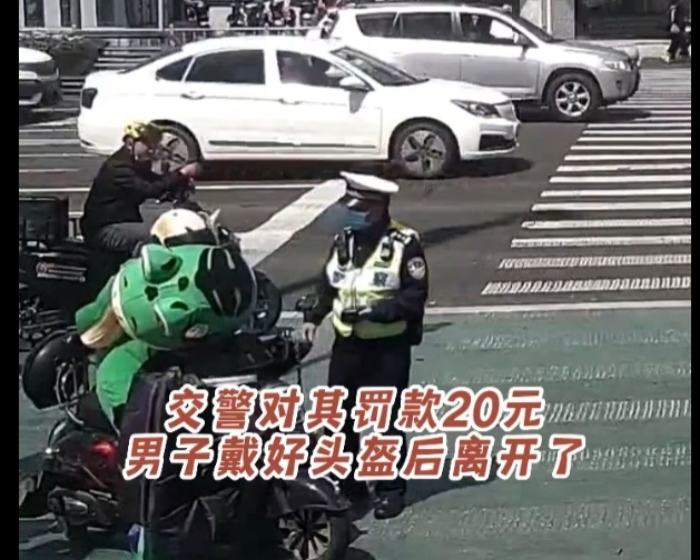 于是,交警对其违法行为处以20元罚款的处罚。之后,男子在交警教育下,将头套摘下,佩戴好安全头盔后骑着电动自行车离开。