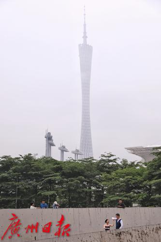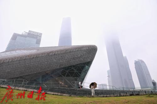 一对情侣在大剧院拍照,他们身后的广州塔在雨雾中若隐若现。