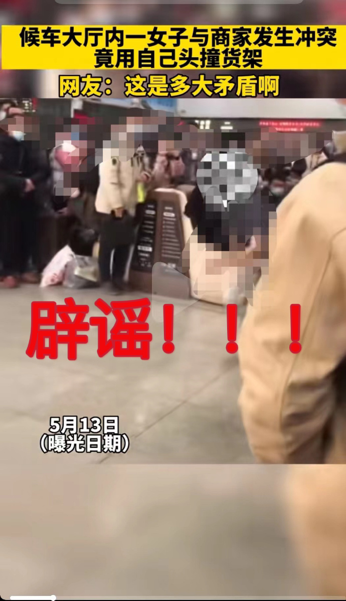 今晚,广铁集团长沙火车站官方微博发帖辟谣:网传“5月13日候车大厅内一女子与商家发生冲突竟用自己头撞货架”的视频被网友关注,经调查核实,此系谣言。