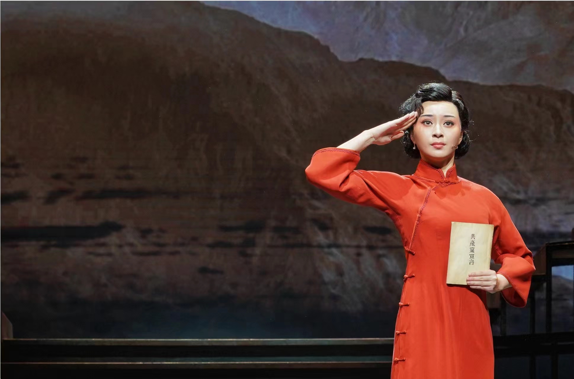 当晚,随着锣鼓声起,以1927年广州起义为背景的黄梅戏《共产党宣言》开启——长期坚持亲手刻写油印“小册子”(《共产党宣言》)的林雨霏被捕入狱,面对百般利诱和死亡威胁,特别是面对因不明真相而关押审讯自己的亲生儿子,以她对革命信仰的忠贞不渝和舍生忘死的精神气节,播撒革命火种,教育挽救年轻一代,实现红色基因延续传承,用鲜血和生命谱写一部中国共产党人的《共产党宣言》。该剧的尾声,当林雨霏高举着《共产党宣言》,一步一步铿锵前行的那一刻,引发了台下观众最强烈的共鸣。