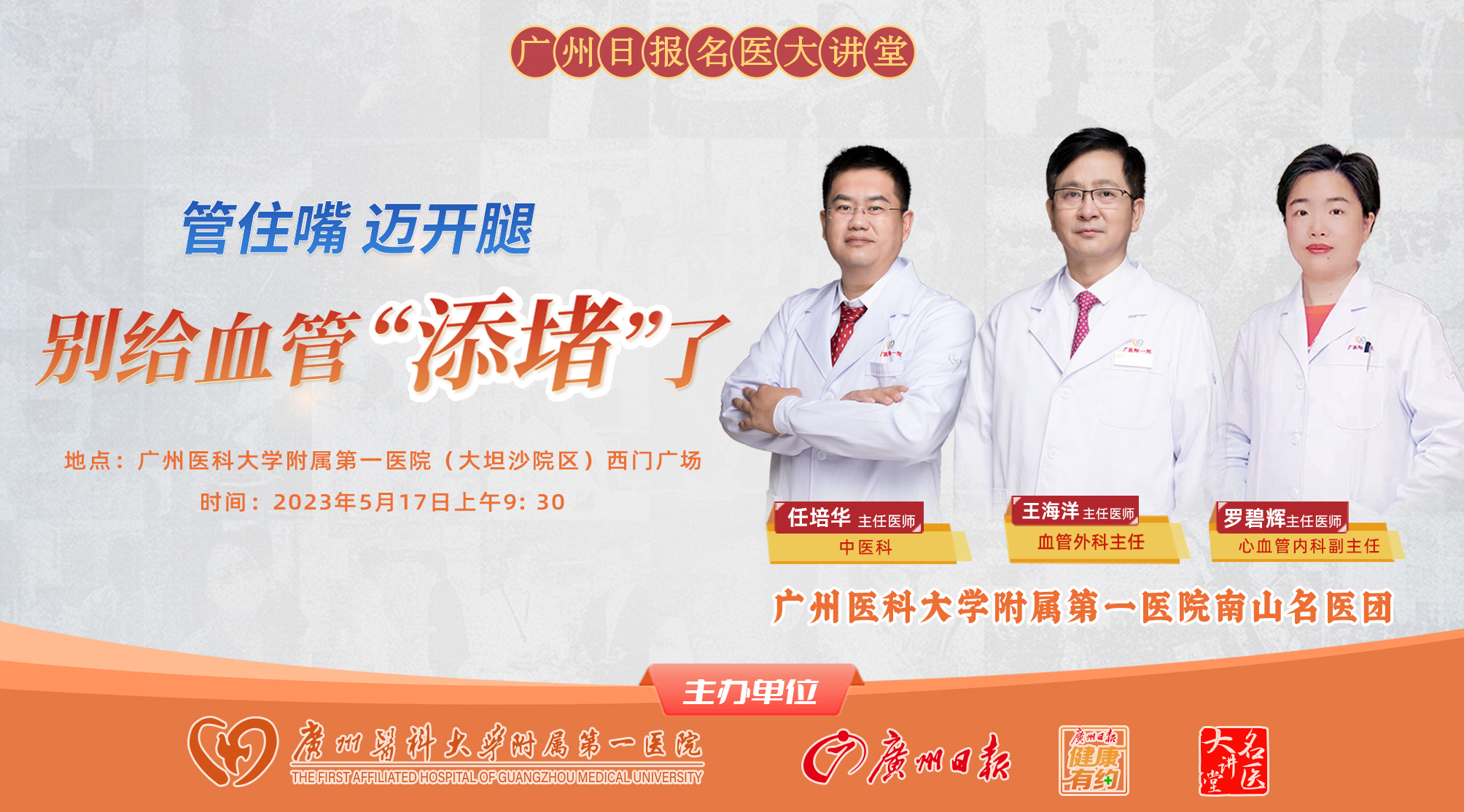 5月17日上午,广州医科大学附属第一医院多学科专家团队还将到现场举办义诊活动,参与的科室包括血管外、心内科、中医科、介入科、心脏外科、药学部、静脉治疗护理组、医保办、预防保健等,有需要的街坊别错过了。