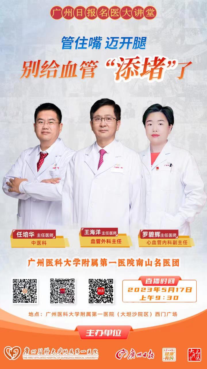 2023年5月18日是第13个全国血管健康日。在全国血管健康日来临之际,广州医科大学附属第一医院血管外科主任王海洋主任医师、心血管内科罗碧辉主任医师和中医科任培华主任医师等多学科专家组成的南山名医团将于5月17日上午9:30在该院大坦沙院区西门广场接力开讲,为大家支招如何保护血管健康,预防动脉斑块、远离下肢静脉曲张和冠心病等常见的血管疾病。