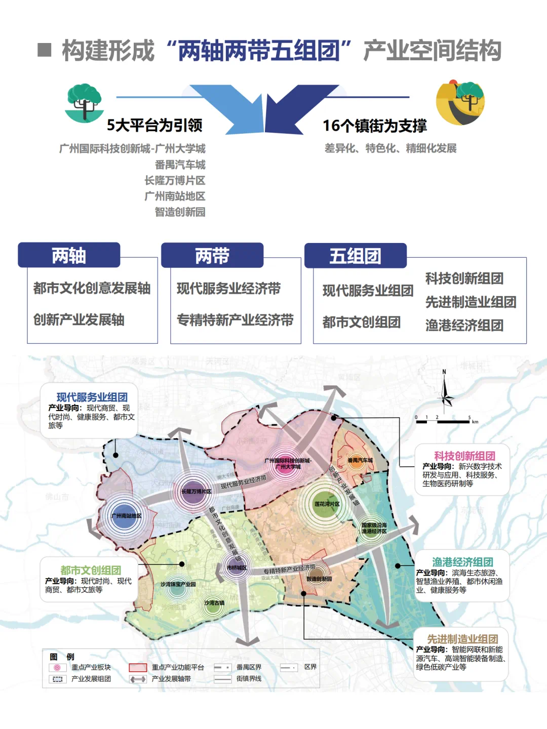 征求意见稿显示,改革开放40余年,番禺抓住了全球产业转移和城镇化快速发展的战略机遇,实现了由城市边缘的农业县向制造业基础扎实、行业聚集、品类齐全、产业链结构完整的现代化都市城区的历史性转变。近年来,依托广州国际科技创新城-广州大学城、番禺汽车城、长隆万博片区、广州南站地区等平台,全区以智能网联和新能源汽车、数字经济、现代服务业等为切入点,加速推进了产业的转型升级、换道布局和创新发展。