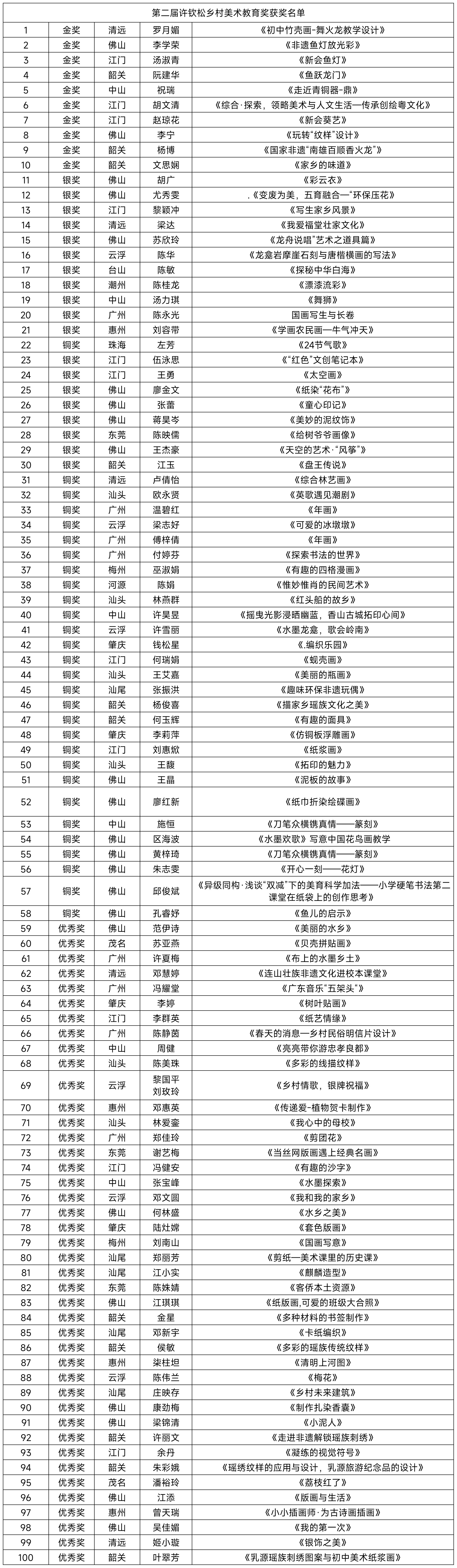 该奖项主要面向广东省各县(市区)镇级(含镇级)以下农村从事中小学美术课教学工作的专职或兼职美术教师。根据教师提交的教学详案、课程开发说明以及与该课程相关的学生作业图,从课程定位、课程特色、课程目标、教学方法与手段、评价设计、推广价值等维度,秉持着公平公正的原则,评选出乡村特色美术课程。经过美育专家及美术教研员的共同进行评选,本届大赛共计评选出金奖10名,银奖20名,铜奖30名,优秀奖40名。