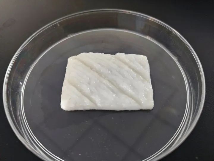 该项研究中,科研人员以大黄鱼为研究对象,分离出具有高传代能力的肌肉、脂肪干细胞,并通过调控两种信号通路诱导肌肉干细胞分化;基于可食用凝胶改造仿生建构鱼肌支架,产生类似自然鱼肉该有的结构和纹路,令肌肉细胞沿着3D打印的仿生结构有规则地生长,形成三维培养肌纤维束,实现组织状细胞培养鱼肉的制造。