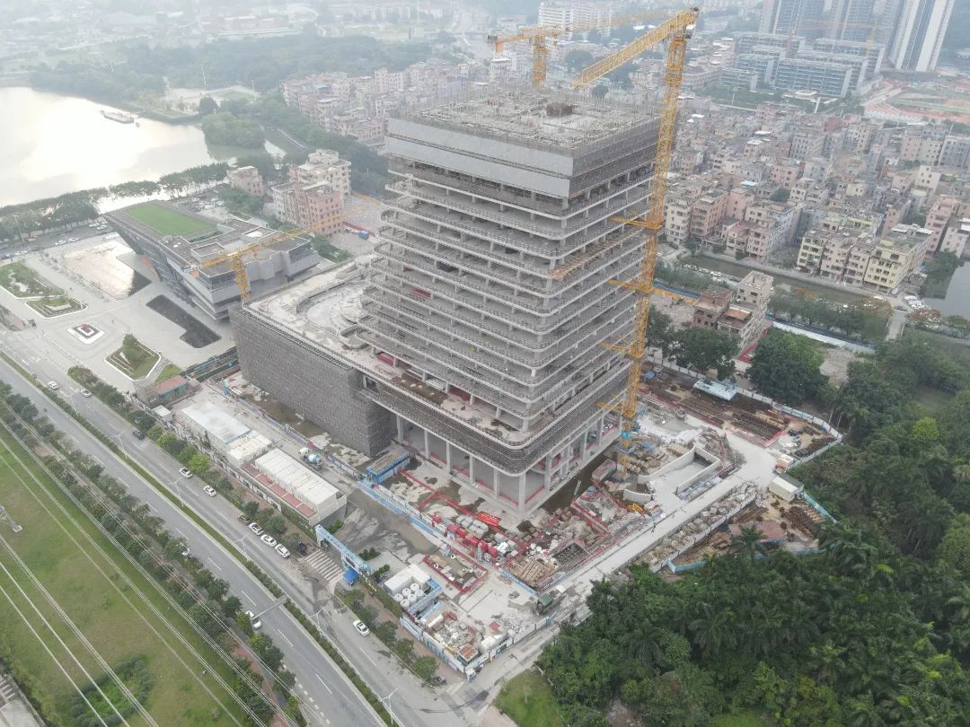 近日,位于南海神庙文旅核心区的外贸博物馆和文化总部中心项正式封顶。该项目毗邻广州海事博物馆,总建筑面积8.78万㎡,总高度86.95m,其中地下两层,地上19层。裙楼六层以下为外贸博物馆,塔楼六层以上为文化总部中心,整体结构为“钢筋混凝土外框架+核心筒体系”。