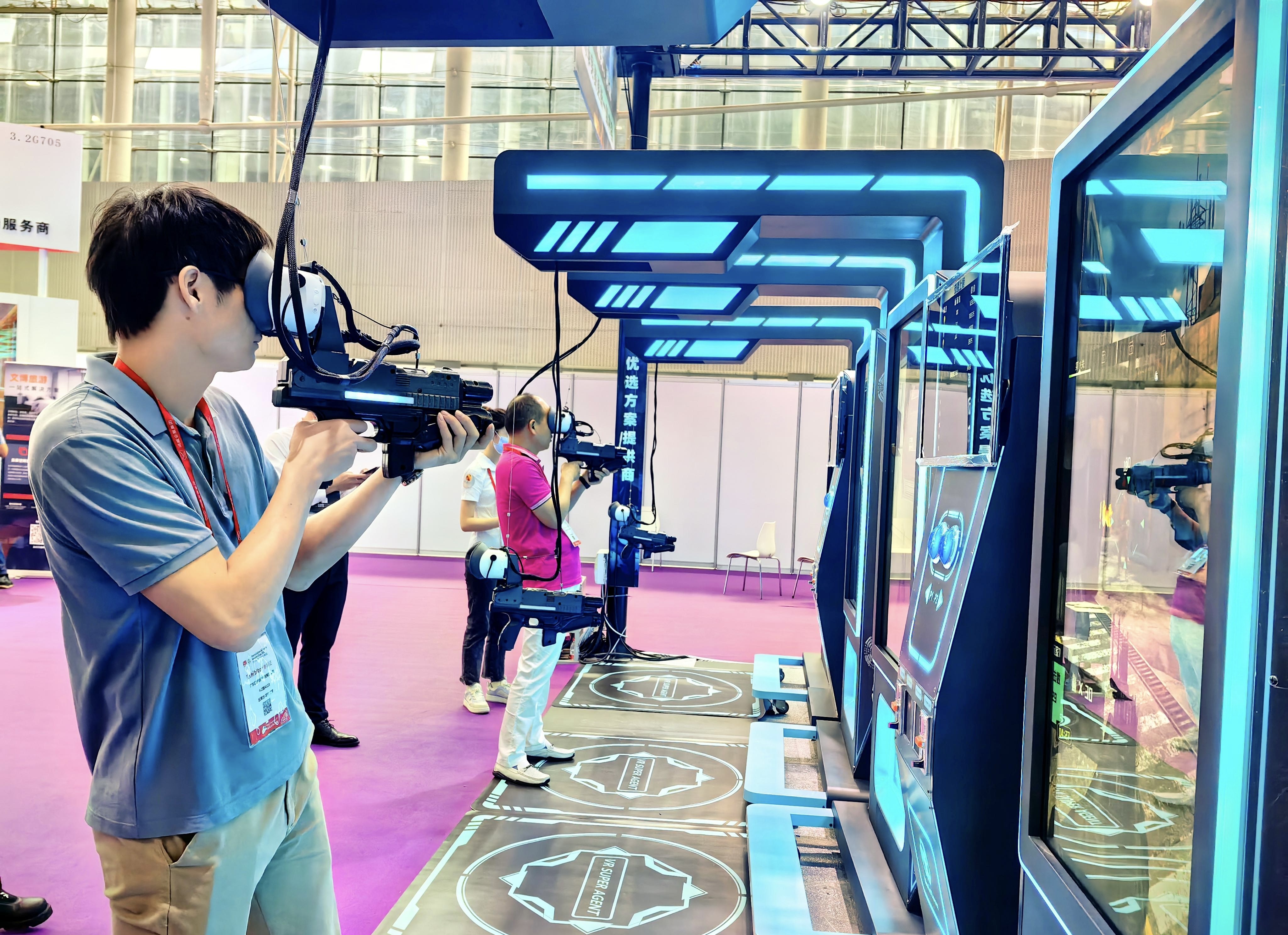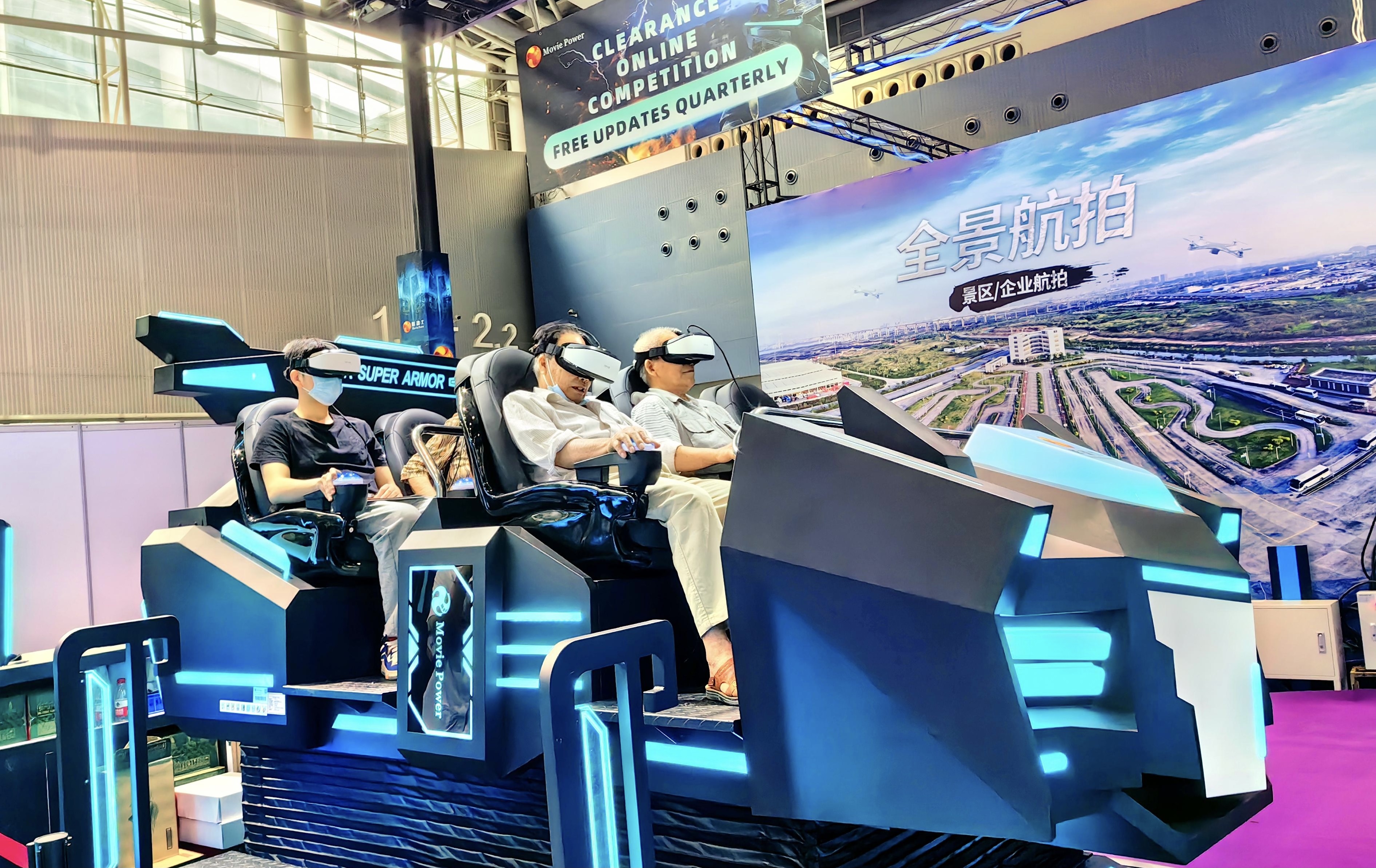 除了新品“时空乘骑”,本次广州市影擎电子科技有限公司还携带最多采购商购买的超能系列,现场同样深受男女老少喜爱。其中产品超能机甲炫酷的外观造型,内附的游戏也是多样化,能同时坐上多人参与,记者在现场看到,不少上了年纪的叔叔阿姨都来体验这款产品。“现在VR产品在防眩晕和防模糊方面都做得很好,老少兼可玩。”朱伟明说。而超能特工也让一众的玩家过足枪战瘾,不少玩家都表示游戏场面逼真,相当刺激。朱伟明说,他们的相关系列,借鉴了游戏过关卡的新玩法,并且不用佩戴VR眼镜,直接把设备往眼睛上一卡就行,非常方便。