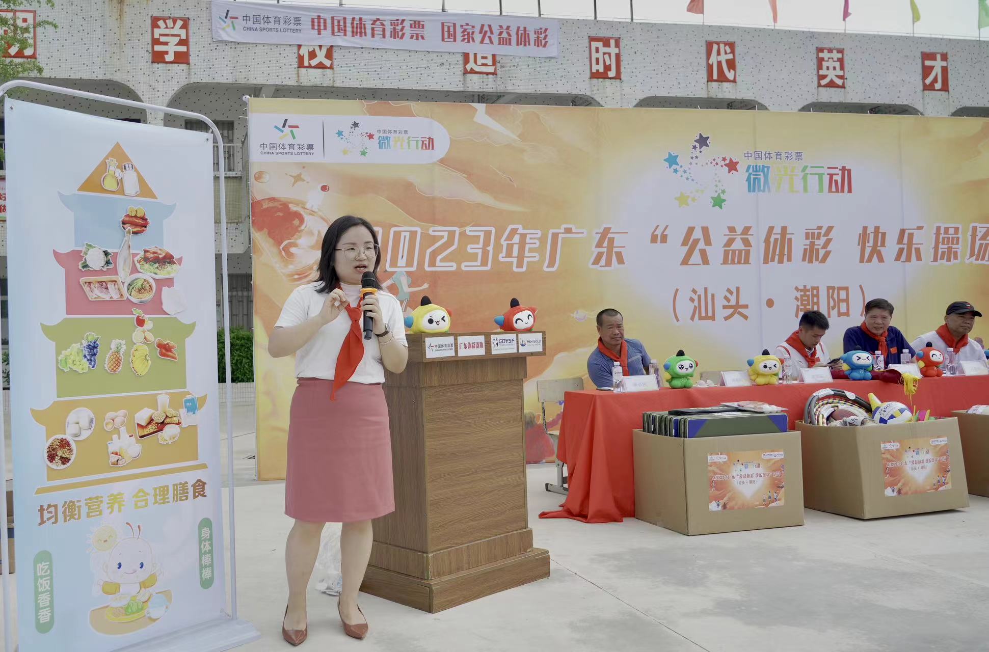让“绿色健康”的理念持续发光发热,2023年“中国体育彩票微光行动”广东“公益体彩 快乐操场”公益活动5月18日在汕头市潮阳区关埠堂后学校快乐举行,2012年伦敦跳水奥运冠军张雁全、国家高级营养师徐小兰到现场与学生们热情互动,助力青少年健康成长。