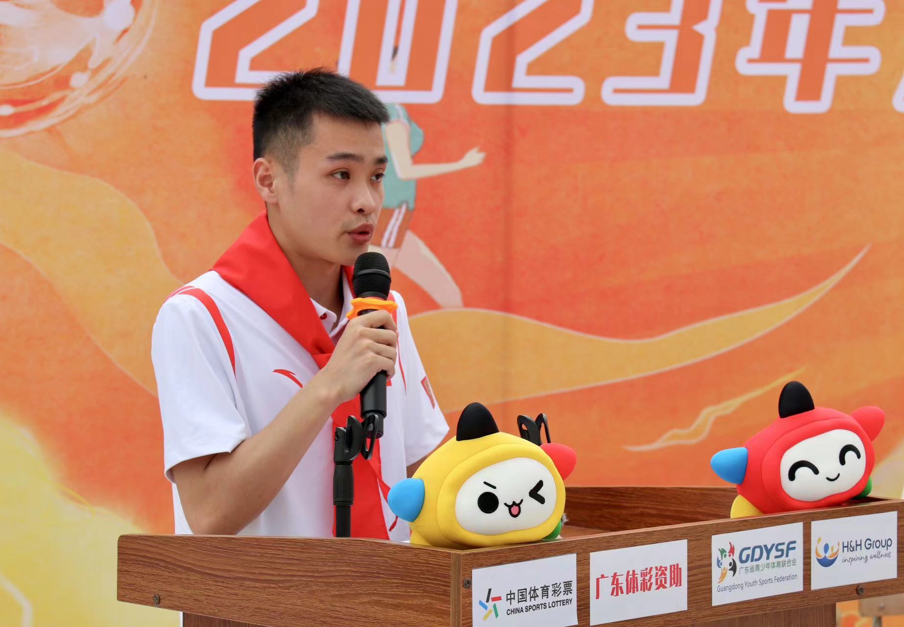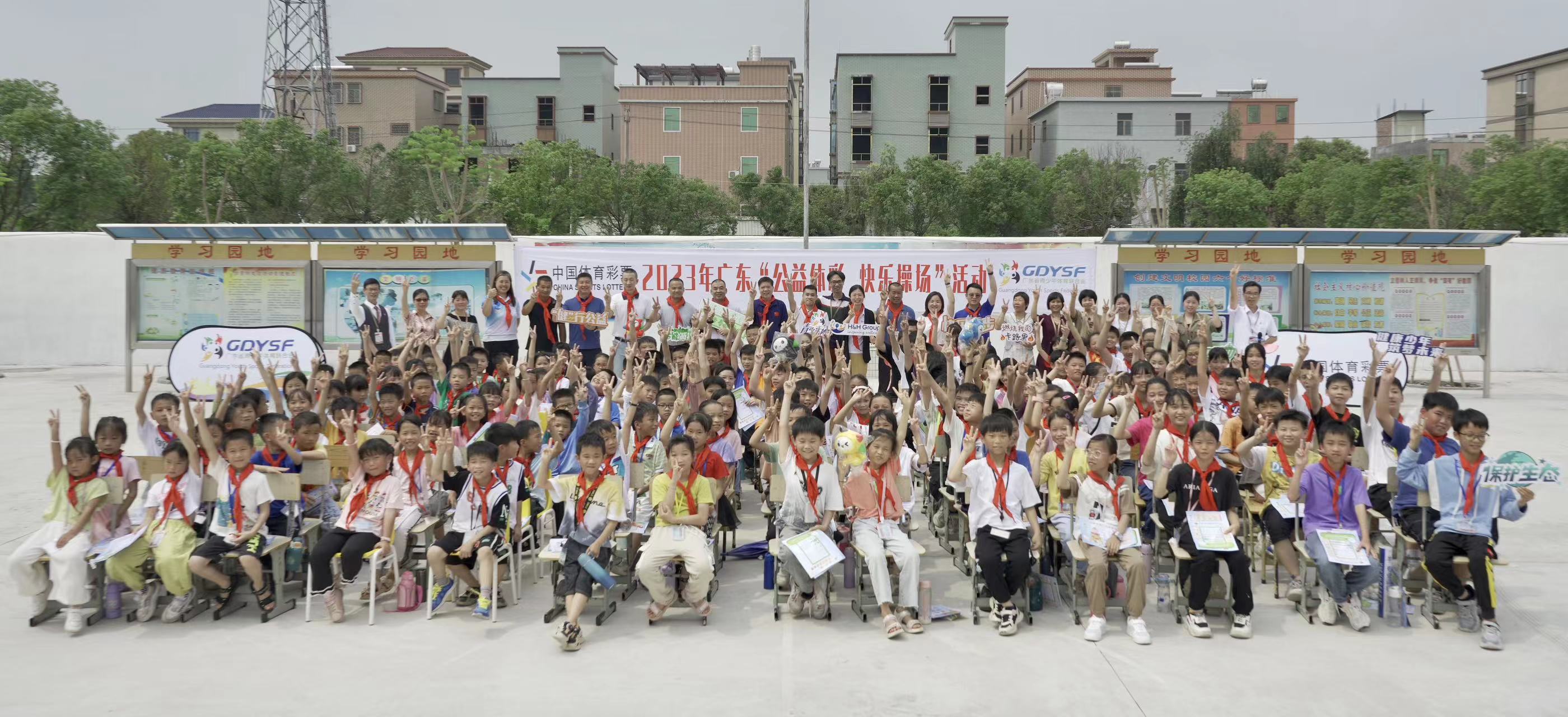 活动在庄严的升旗仪式中徐徐拉开帷幕,参会的领导嘉宾都佩戴了红领巾,与现场师生一起唱国歌,向国旗行注目礼。随后,广东省体育彩票中心、广东省青少年体育联合会向学校捐赠了体育器材。