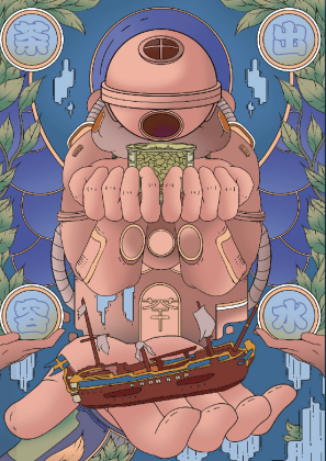 金奖作品:“出水茶容”以从瑞典“哥德堡号”沉船打捞出水的、经广州出口的福建白毫茶为元素,将这藏于广州博物馆中、见证了“海丝”繁荣的大宗出口品与潜水员打捞其出水的场景相结合,加以艺术化的加工,造成了一件既有古韵,又有当代设计表达趣味的佳作。